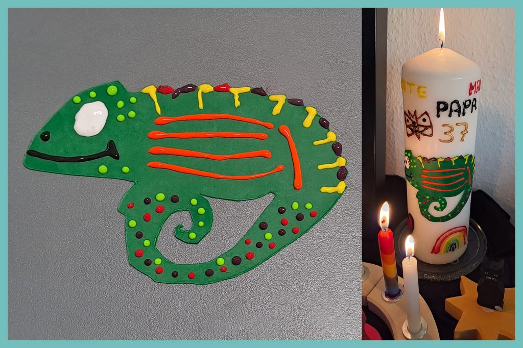 Ein kleiner Junge hat mit seiner Mutter eine Kerze für den verstorbenen Vater gestaltet. Als Hauptmotiv haben beide ein Chamäleon gewählt, das Krafttier ihrer Familie. Das Chamäleon steht für Wandelbarkeit, Anpassungsfähigkeit und Stärke und bleibt dennoch immer es selbst....